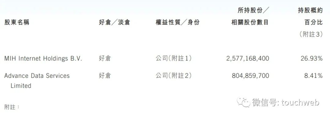 腾讯大股东MIH Internet Holdings B.V持有2,577,168,400股,持股26.93%。MIH 由Naspers Limited 透过其非全资附属公司Prosus N.V. 控制。MIH Internet Holdings B.V. 为Prosus N.V. 的全资附属公司。