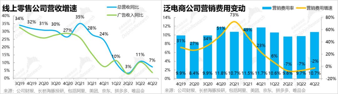 (2)宏观层面的逆风外,电商公司间的竞争格局也超预期的恶化了。4Q的业绩中已初现端倪,4Q泛电商公司整体营销费用同比降幅已从二、三季度时的-7%缩窄到了-2%,可见电商们已在开始重启投入周期,暂时的躺平已经过去。