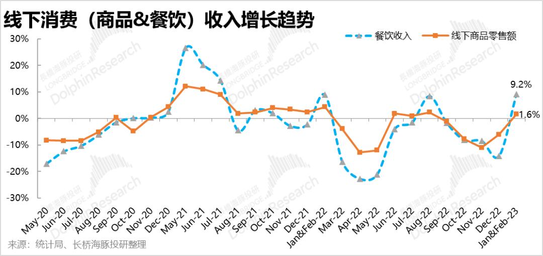 如同海豚君在年前展望报告中预期的,防控解除后消费势必会迎来整体性的复苏,但从结构上,但线下消费场景和流量开始复苏,也会线上消费的红利减少。统计局最新公布的1-2月社零数据,基本上验证了上述预期,具体来看: