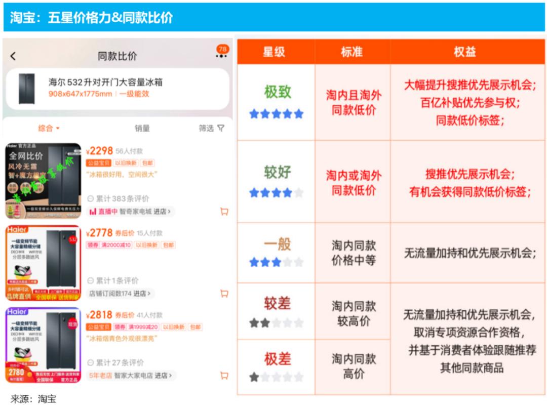 (1)京东和阿里的尝试:如上文所述,目前京东和阿里的举措可以分成两种类型,一是价格补贴类的“百亿补贴”和“9.9特卖”,二是流放分发机制上,“五星价格力”等给与低价商家的流量倾斜。