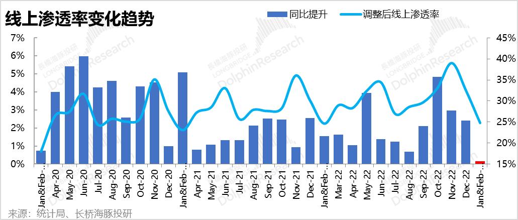 2)从线上零售渗透率(剔除汽车零售)的角度,今年1-2月渗透率为24.8%,同比提升幅度仅为0.2pct。从下图清晰可见,今年是自新冠以来线上渗透率提升最小的一次(除2021年3月曾因基数过高出过渗透率同比下降)。
