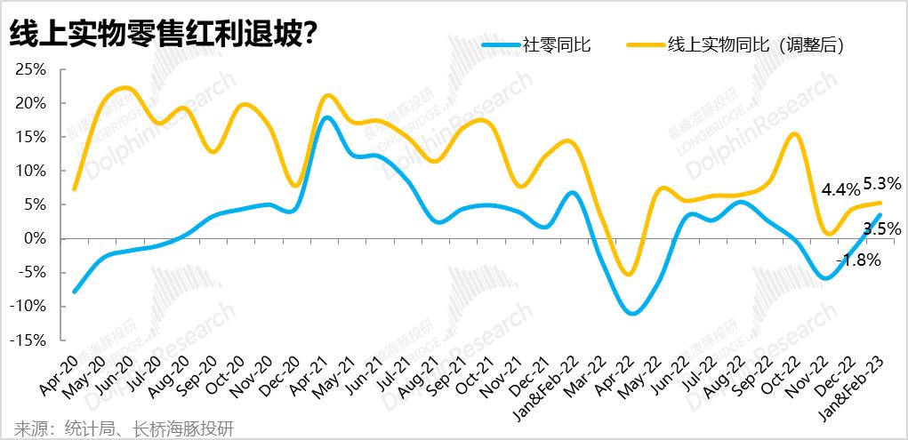 1)社零总额增速从4Q22的-2.7%快速修复到了+3.5%。与此同时,线上实物零售增速不仅没有提升,反而由4Q的6.4%略微放缓到了5.3%。