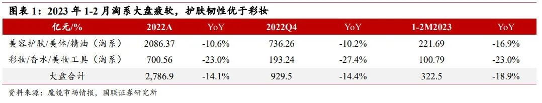 根据第三方机构数据,1-2月淘系平台上美容护肤和彩妆品类销售额仍同比萎缩了19%,相比22Q4的-14.4%反而进一步恶化了。