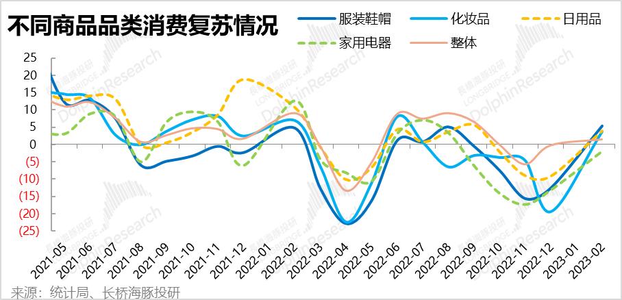 根据1-2月的规模以上社零数据,可选消费中典型的服装鞋帽和化妆品零售增速分别从12月时同比萎缩-12%~-19%,迅速反弹到了+5.4%和+3.8%,明显高于整体1.5%的增速。因此1-2月可选商品消费全渠道消费额的确出现了比较强劲的复苏。