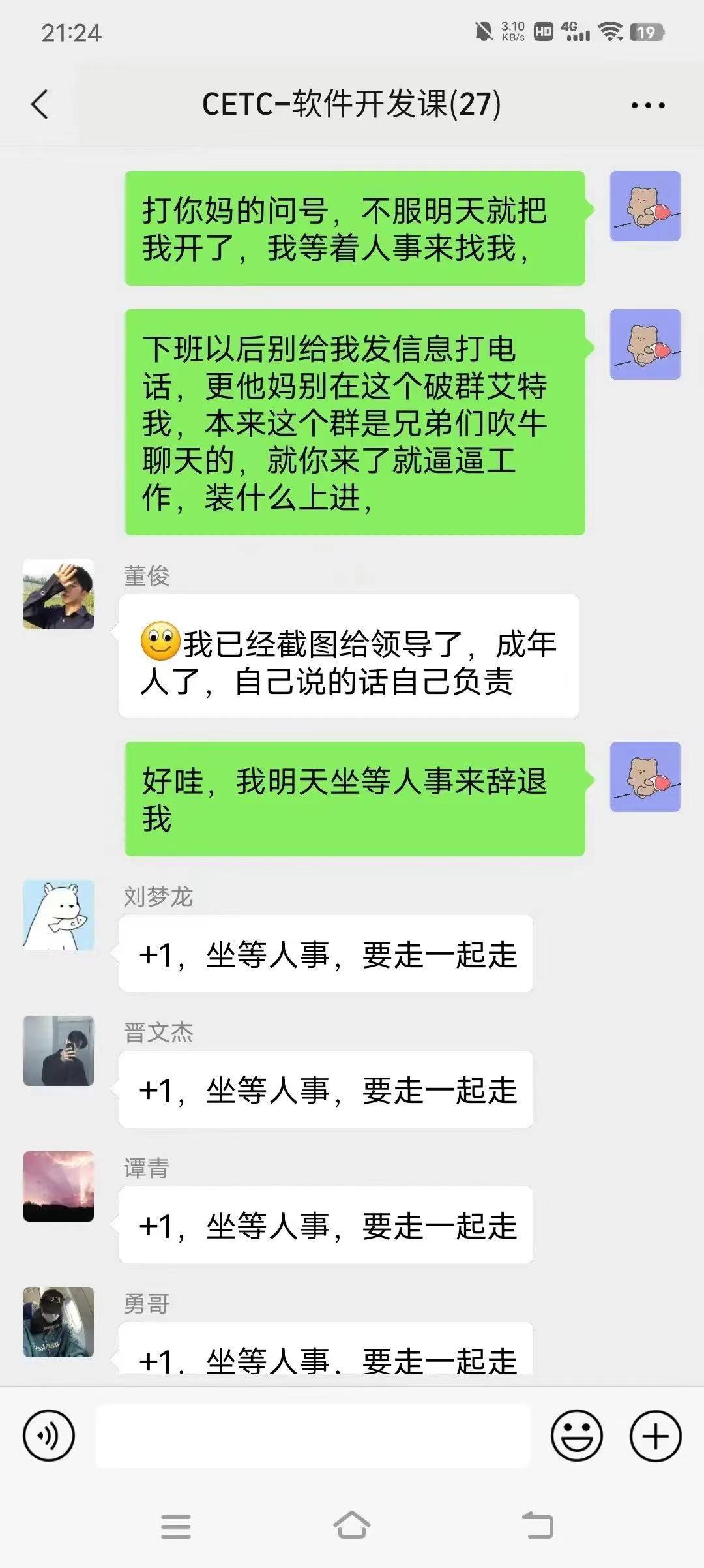 2023年4月5日,四川德阳警方经调查后向社会公布此次事件初步调查结果:陈某龙(男,汉族,26岁)目前居住在德阳经开区,系网上发布不实信息者,此人从未有中国电科下属单位及关联企业从业经历。因此前向中国电科求职未被录用,心生不满,利用图像处理软件虚设“CETC—软件开发课”“CETC成都事业部”2个微信群,虚拟CETC员工姓名、头像,捏造制作了多张“怒怼领导、发泄情绪”的微信聊天记录截图,并发布在网络社交平台,引发公众热议,造成恶劣影响,目前已被行政拘留。