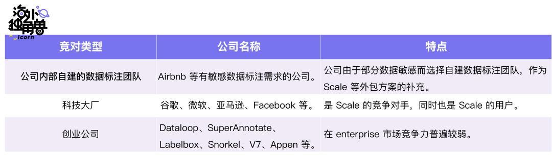 Scale 的竞争对手包括:公司内部自建的数据标注团队;谷歌、微软和亚马逊等科技大厂的数据标注服务;数据标注创业公司。