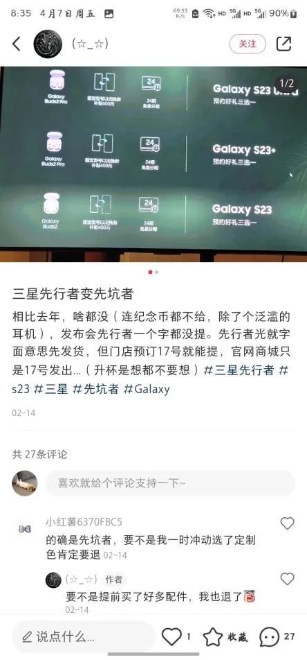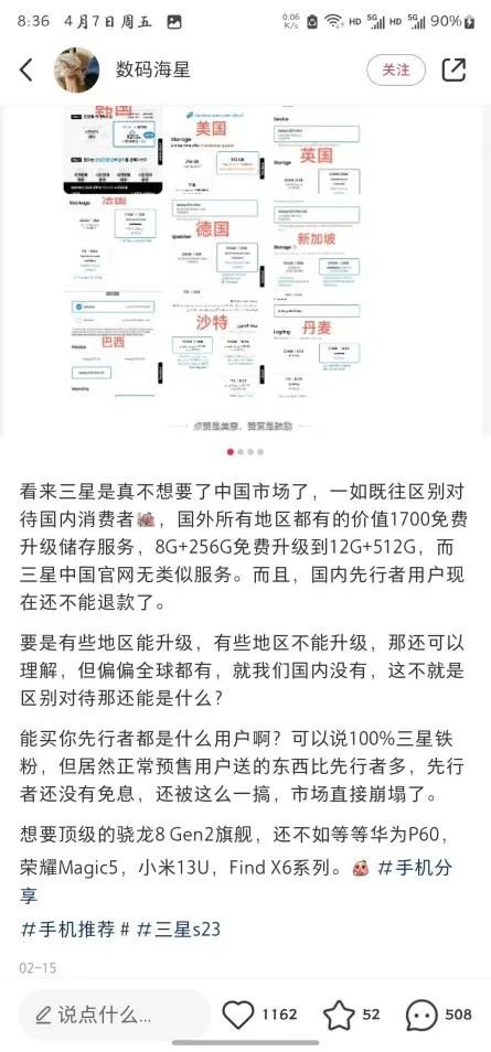 以其今年发布的新品S23系列“先行者”产品为例。根据消费者反馈,国外市场都有价值1700元的免费升级储存服务,将产品从8G+256G免费升级至12G+512G。但三星中国官网并无类似服务;且国内“先行者”用户不能退款,预售用户的赠品比“先行者”还多……