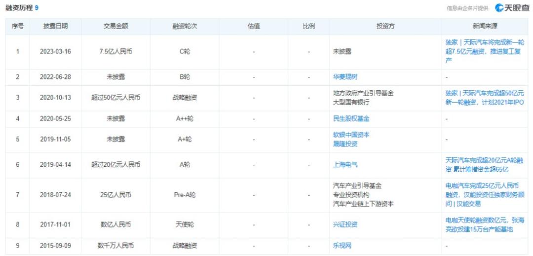 有消息称,天际汽车近期正在推进新一轮融资,但对于“超7.5亿元融资”的传闻,该人士表示,“具体融资金额等细节,暂不便透露。”对于背后的投资机构是谁,也没有进行披露。