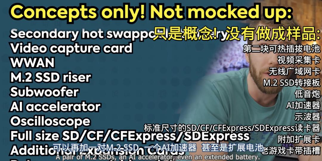 更让我想不到的是,这个独显模块不仅能给显卡用,还能成为一个拓展坞,比如可以放置固态硬盘、 AI 加速器、可快拆电池——不过这些玩意儿都是老莱画的大饼,还没有样品出来。。。