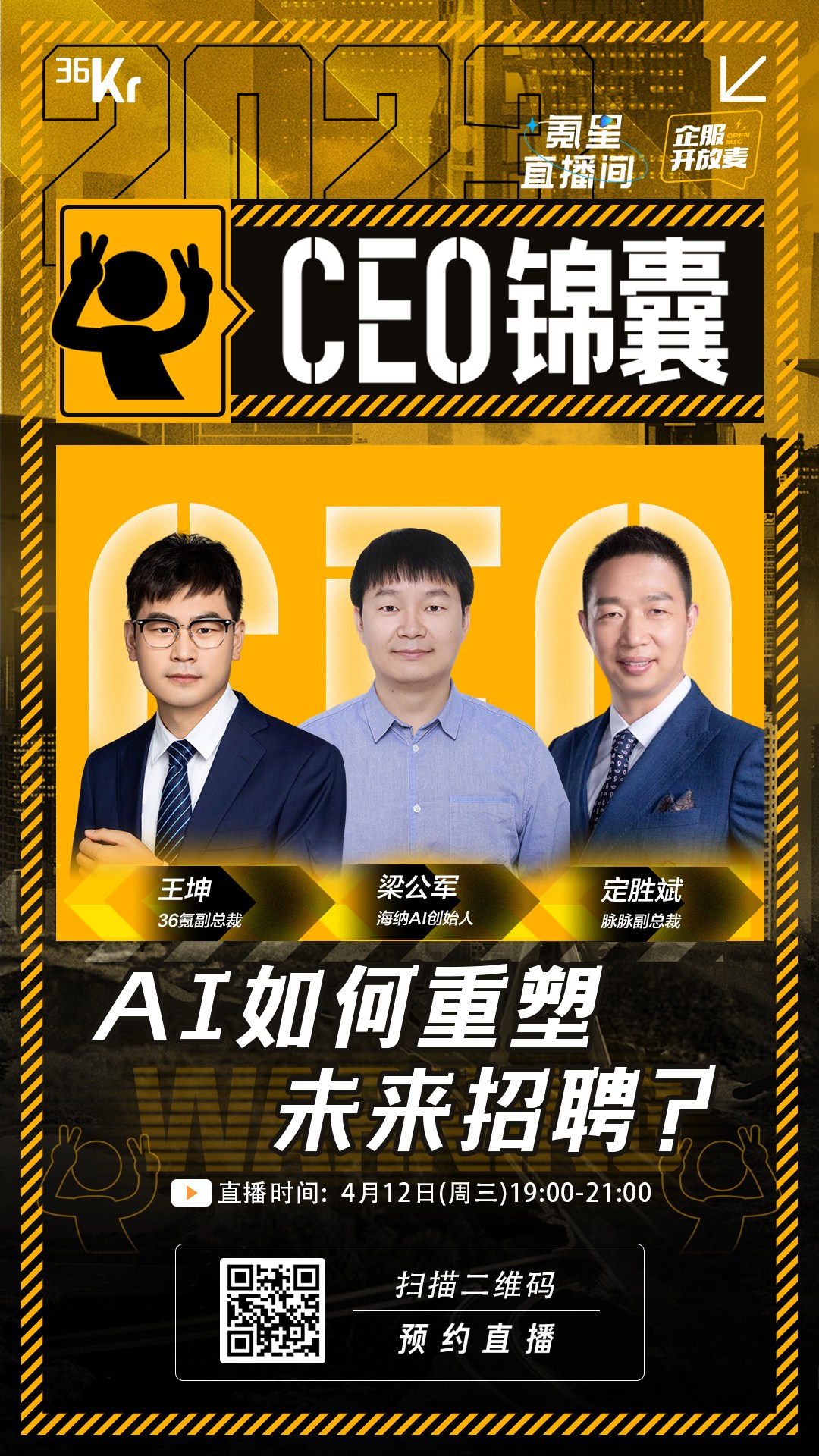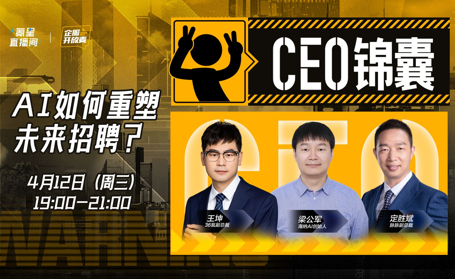 本期36氪企服点评《CEO锦囊》,36氪副总裁、36氪企服点评业务负责人王坤,将与海纳AI创始人梁公军、脉脉副总裁定胜斌深入探讨以下话题: