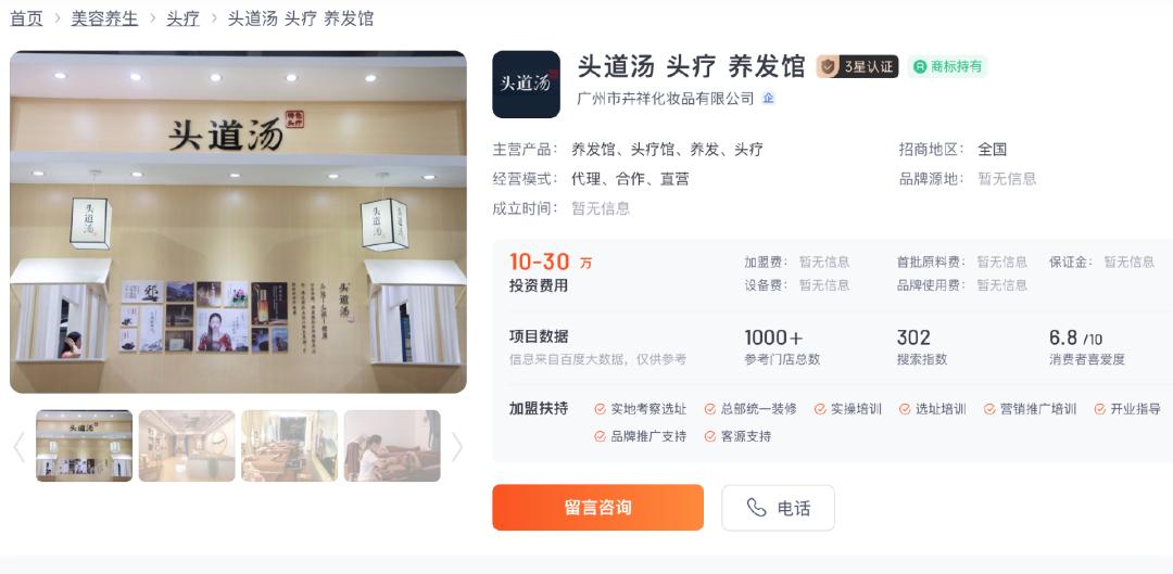 头道汤等品牌崛起,四处都能看到加盟店广告。10-30万就可以加盟开一家头疗馆,线下加盟店已经达到1000多家。
