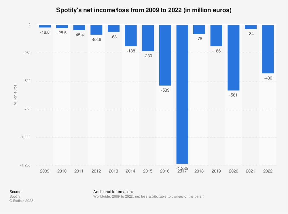 但一个尴尬的现实是,尽管有那么多的付费用户,但流媒体平台仍然解决不了盈利难的问题。2022年,坐拥2.05亿付费用户的全球最大音乐流媒体服务商Spotify,净亏损高达4.3亿欧元,约33.7亿人民币。