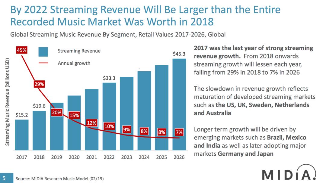 但无论是哪方的数据,似乎都证明了这样一个趋势:音乐流媒体收入高增长阶段结束了,接下来会是一个相对平缓的增长期。