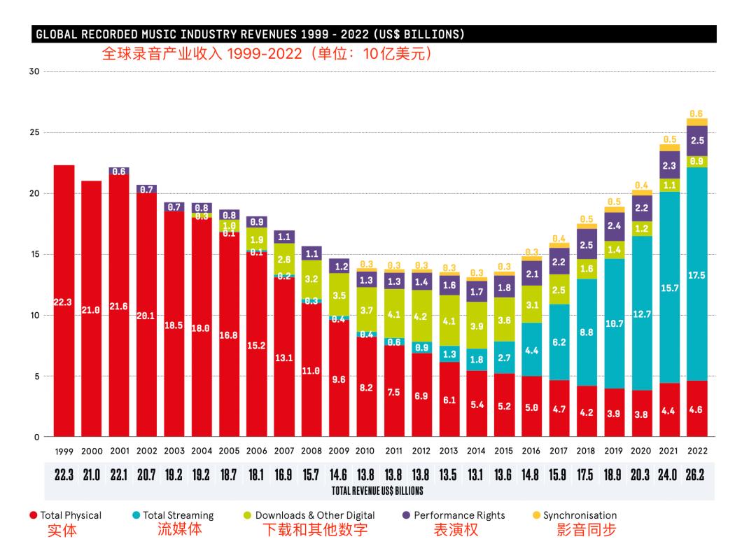 这是一个令人担忧的数字。2021年,流媒体收入还同比增长了24.3%,转眼一下就少一倍多。尽管这没有影响2022年全球录音产业的总体增长,但2022年的全球录音产业总收入增幅只有9%,这显然跟流媒体收入增长缓慢有关。相比之下,2021年,全球录音产业总收入增长18.5%。