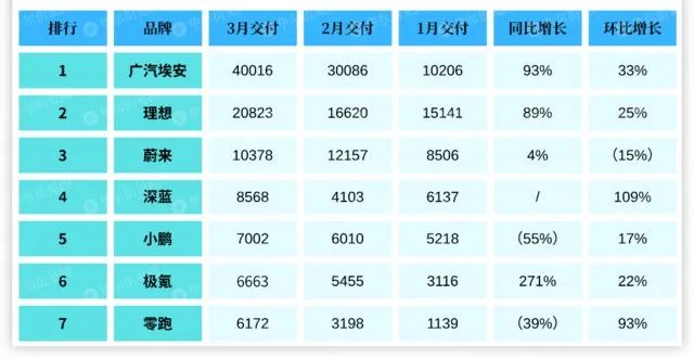 在3月交付榜上,广汽埃安的销量冲破4万大关,比新势力蔚小理加起来还要多,也把零跑、哪吒等新新势力远远甩在身后。