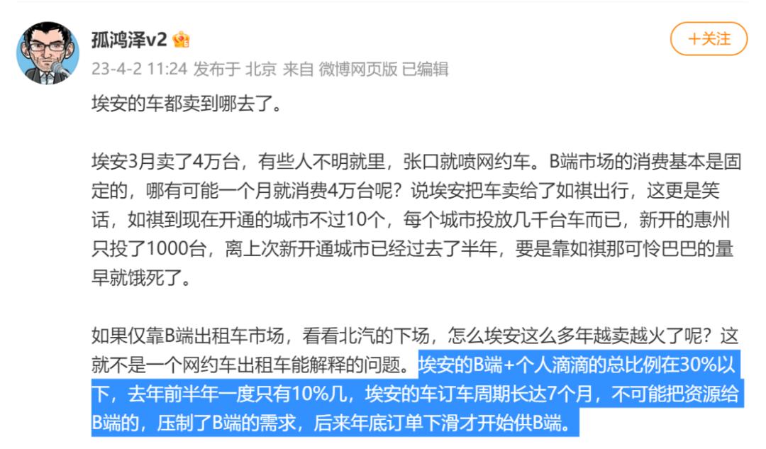 有知名博主在微博上透露,埃安B端+个人滴滴的总比例在30%以下,去年前半年一度只有百分之十几,埃安的车订车周期长达7个月,不可能把资源给B端的,后来年底订单下滑才开始供B端。