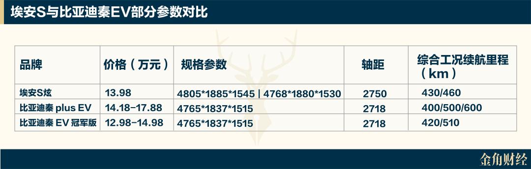 比如说埃安的两款主力车型埃安S与埃安Y,前者对标的是比亚迪的秦EV,后者的直接竞对则是比亚迪元EV。