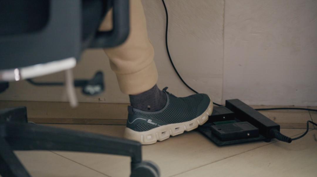 ▲蔡磊无法起身时,用脚踩沙发边的紧急呼叫按钮