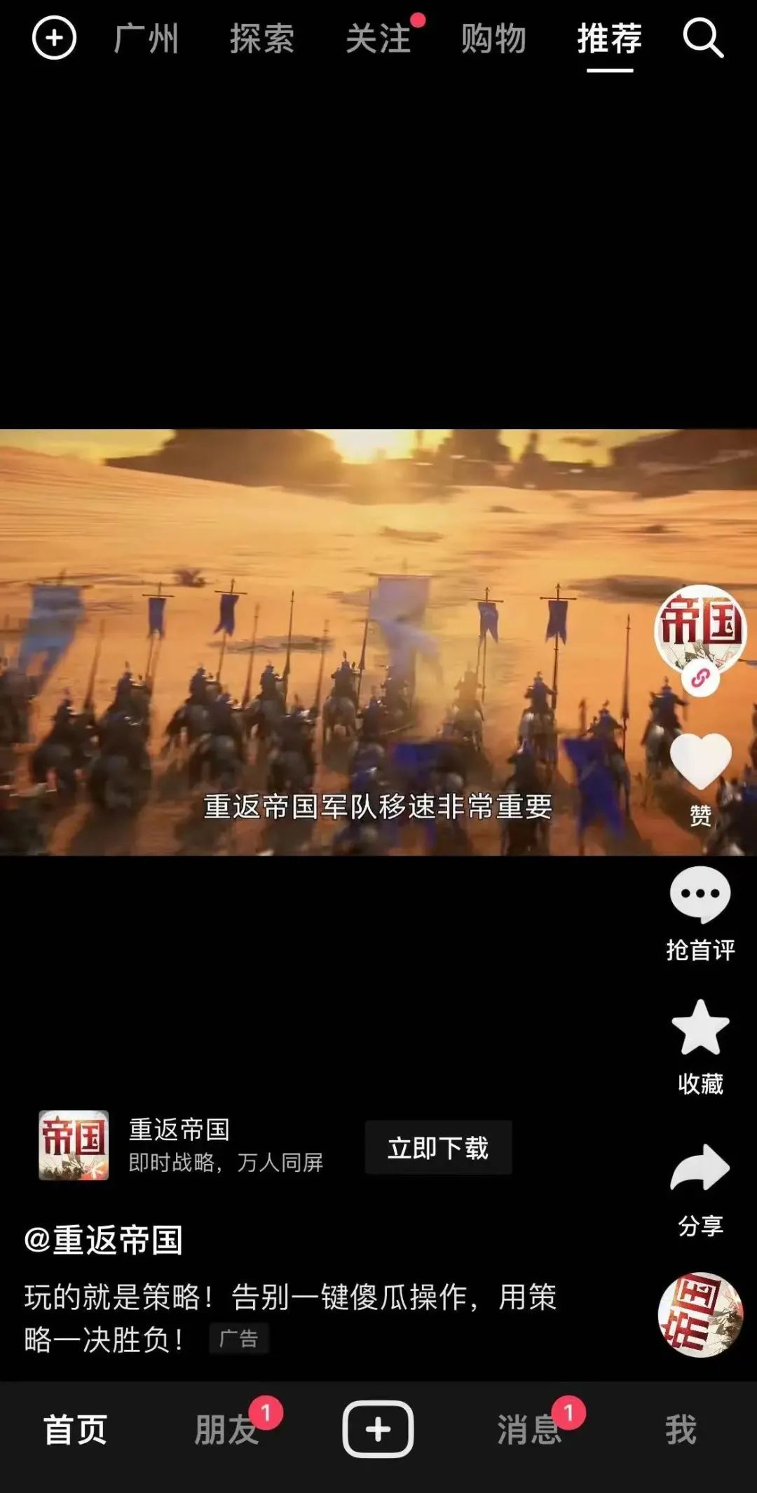 同时,DataEye研究院也在抖音上刷到了《重返帝国》效果广告。