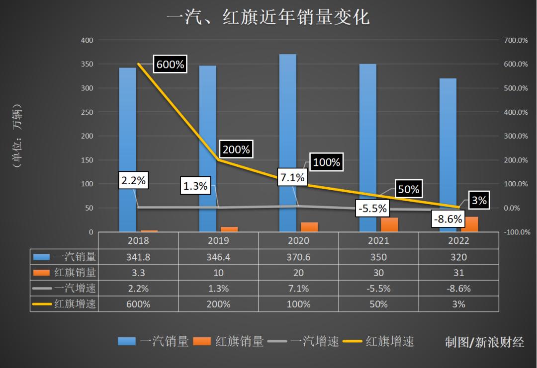 时间来到2022年,红旗的高增速戛然而止,进入瓶颈期。2022年红旗全年销量为31万辆,仅同比增长3%。
