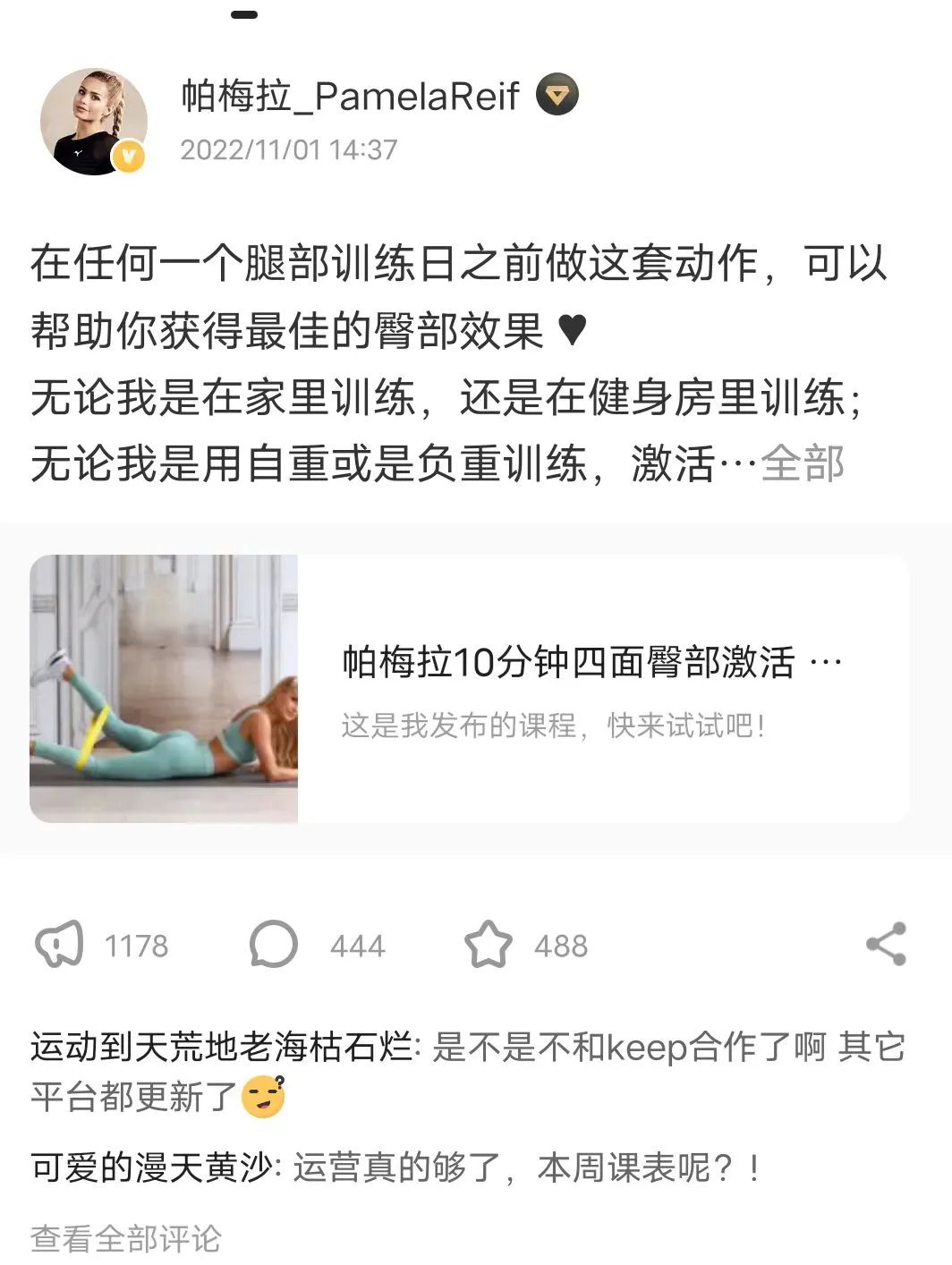 “很多人因为帕姐(帕梅拉)不更新都不来Keep了,估计是Keep遭不住了,赶紧把合约续上。”一位粉丝认为帕梅拉的回归,与一些用户离开Keep有关。