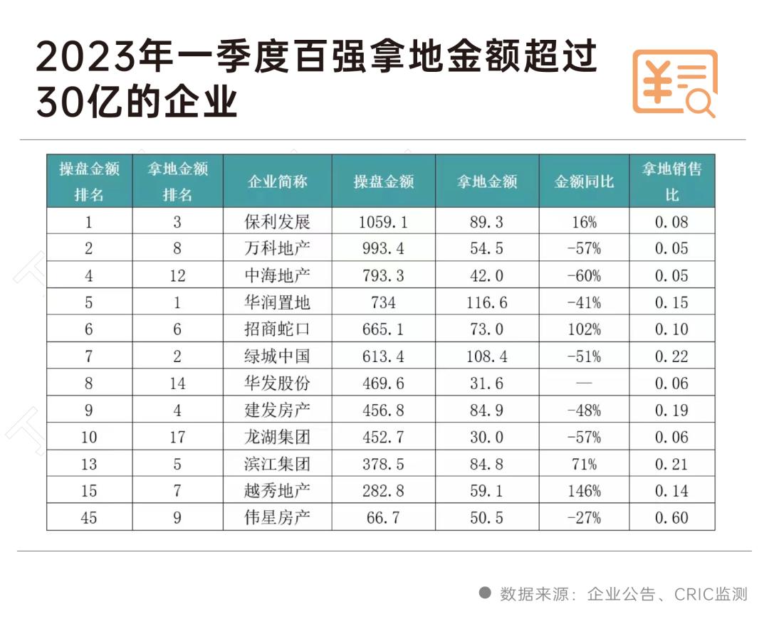 今年这一趋势仍将继续。根据克而瑞的数据,一季度,华润置地、保利发展、招商蛇口、建发房产及绿城中国今年一季度拿地金额均超过70亿元。且房企投资主要聚焦在核心一二线城市以及部分有人口支撑、产业支撑且市场回暖更为明显的强三线城市,仍以谨慎为主,“换仓提质”为先。