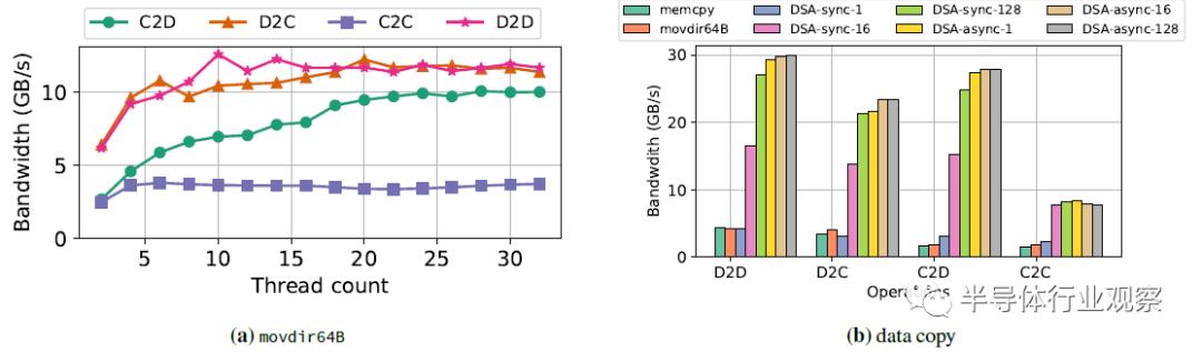 作为SPR的新产品,Intel Data Streaming Accelerator(Intel DSA)使内存移动操作能够从主机处理器上卸载。Intel DSA由工作队列(WQ)和处理引擎(PE)组成,前者用于保存已卸载的工作描述符,后者用于从WQ中提取描述符以进行操作。描述符可以通过等待每个已卸载的描述符完成后再卸载另一个描述符来同步发送,也可以通过连续发送描述符来异步发送,从而使WQ有许多正在运行的描述符。通过设计程序以最佳方式异步使用Intel DSA,可以实现更高的吞吐量。为了进一步提高吞吐量,可以对操作进行批处理以摊销卸载延迟。图4b显示了通过memcpy()或movdir64B在主机处理器上执行内存复制操作,并使用不同批处理大小(如1、16和128)的Intel DSA同步/异步执行内存复制时观察到的最大吞吐量。虽然到Intel DSA的非批处理同步卸载与非批处理内存复制的吞吐量相匹配,但任何级别的异步或批处理都会带来改进。此外,与仅使用CXL连接的内存相比,拆分源数据位置和目标数据位置可产生更高的吞吐量,C2D案例报告称,由于DRAM上的写入延迟较低,因此吞吐量更高。