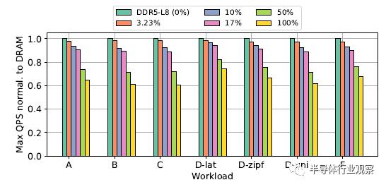 图7:Redis最大QPS。测试具有各种CXL内存配置的最大可持续Redis QPS。图例表示Redis内存分配给CXL内存的百分比。YCSB工作负载D默认读取最近插入的元素(lat),但我们也用Zipfian(zipf)或uniform(uni)分布中的读取请求测试了该工作负载,以查看对访问位置的影响。这里省略了工作负载E,因为它是范围查询。