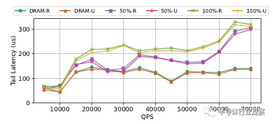 我们认为,尾部延迟差距归因于Redis查询的超低响应延迟,使这些μs级响应的延迟对内存访问延迟高度敏感。这与我们在第4.2节中给出的延迟测量结果非常相关,其中CXL内存访问延迟范围从数百到1000纳秒,比DRAM高2-4倍。然而,中间计算和缓存命中将延迟差异(就应用程序尾部延迟而言)降低到QPS饱和点之前的约2倍。