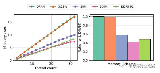 图8:DLRM嵌入减少吞吐量。使用8通道DRAM和CXL内存进行测试;吞吐量与线程数(左);32个线程时标准化为DRAM的不同内存方案的吞吐量(右)