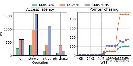 特别地,MEMO具有以下能力:(1)通过使用NUMA_lalloc_node函数从不同的源分配内存,包括本地DDR5内存、CXL内存无CPU NUMA节点或远程DDR5,(2)启动指定数量的测试线程,将每个线程固定到一个内核,并可选地启用或禁用内核,以及(3)使用内联汇编语言执行存储器访问。基准测试报告不同指令(如加载、存储和非临时存储)的内存访问延迟或聚合带宽,所有内存访问都使用AVX-512指令完成。此外,MEMO可以在内存区域上执行指针跟踪,并且通过改变工作集大小(WSS),基准可以显示平均访问延迟如何随着WSS跨越缓存层次结构的不同大小而变化。