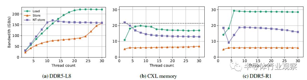 图3:顺序访问带宽。实验显示了8通道(a)的本地DDR5、CXL内存(b)和1通道(c)的远程DDR5的最大可能带宽。(b)中的灰色虚线显示DDR4-2666MT/s的理论最大速度
