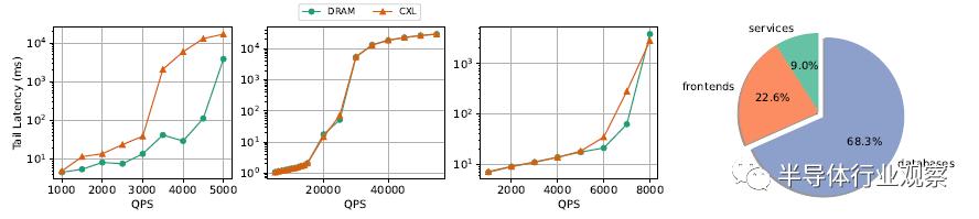 内存延迟受限的应用程序即使将少量工作集分配给延迟较高的内存,也会感知到吞吐量下降。在数据库的情况下,当在CXL内存上运行时,即使QPS离饱和点很远,它们也可能显示出尾部延迟间隙。Redis和memcached等在μs级延迟下运行的数据库在纯CXL内存上运行时受到的惩罚最大。相比之下,具有计算层的毫秒级微服务显示出将内存卸载到CXL内存的良好用例。