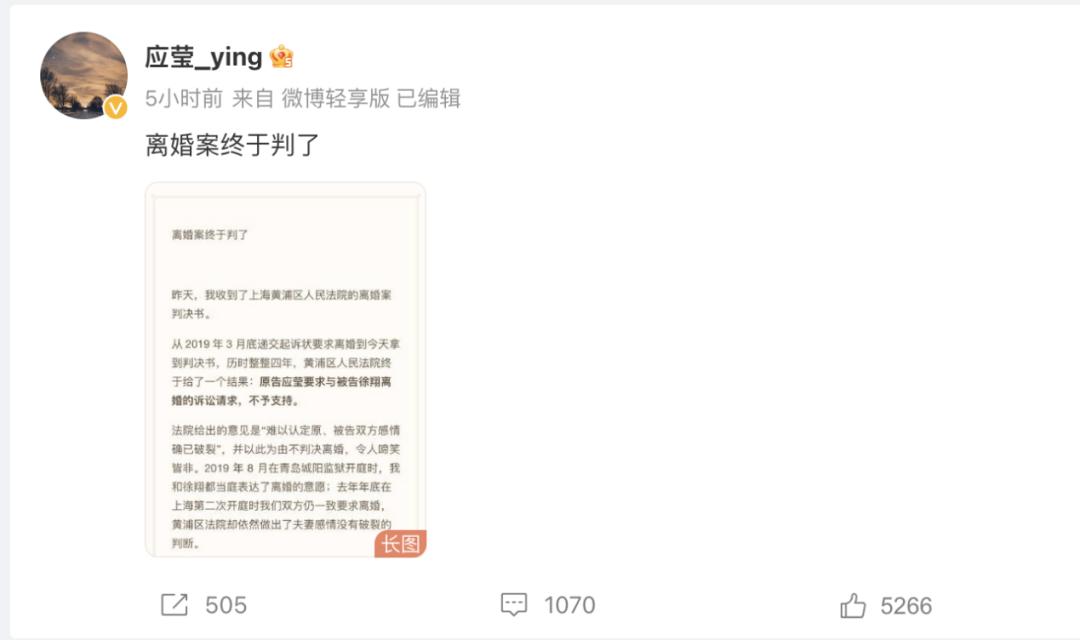 4月初,徐翔的妻子应莹发微博表示,自己与徐翔的离婚诉讼历经四年,却得到了黄浦区人民法院不予支持的结果,自己将继续上诉以求离婚并分割相关财产。