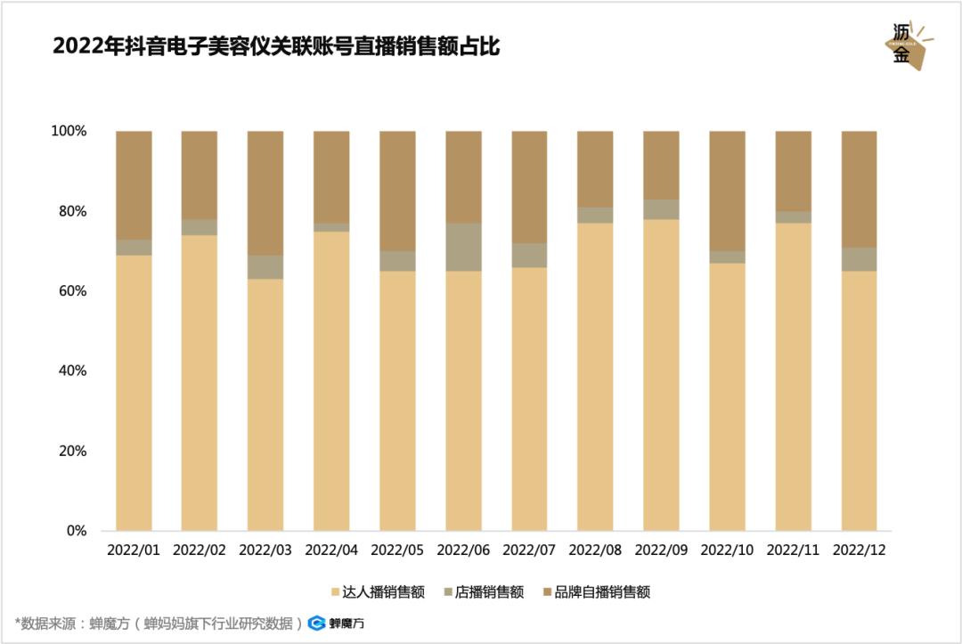 电子美容仪品牌的直播销售额比例较为稳定,普遍选择达人带货,2022年各月达播的销售额占比都保持在50%以上。