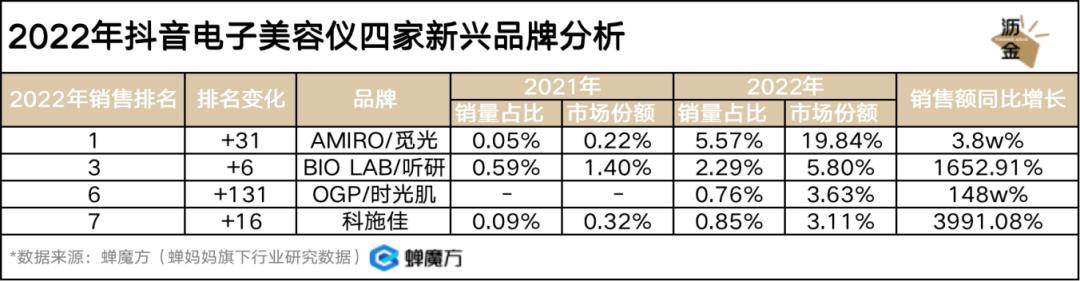 有4家品牌的增长极为明显,它们分别是:AMIRO/觅光、BIOLAB/听研、OGP/时光肌和科施佳。