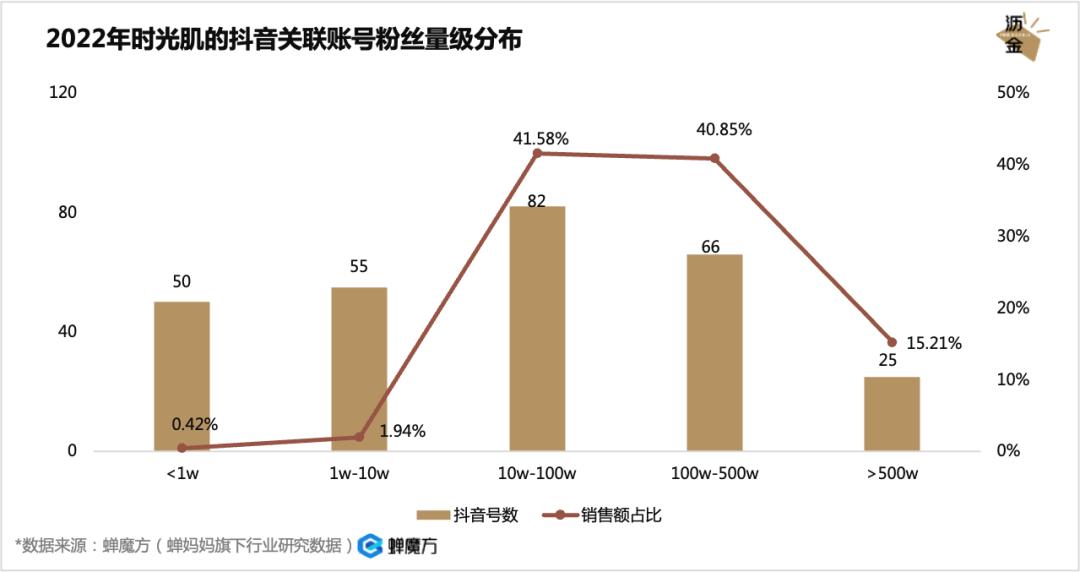 在达人投放上,品牌主要投放10-100万粉丝的腰部抖音号,数量占比高达29.5%,这类达人为品牌贡献了41.58%的销售额。