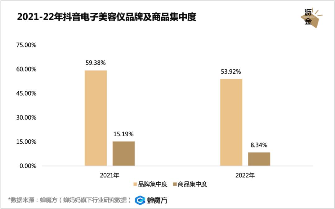 电子美容仪的的品牌数量自2021年的453家增加到2022年的515家,品牌集中度也由21年的59.38%略缩小至约53.92%。