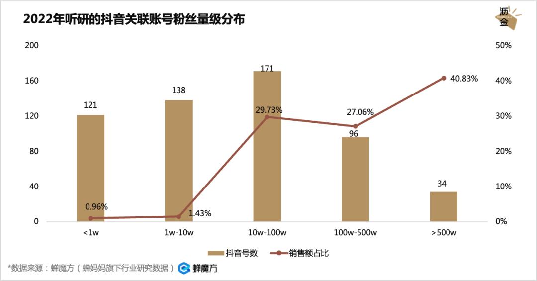 在达人投放上,听研主要布局头部和次头部账号,百万粉以上账号销售额占比近70%。值得注意的是,500万粉丝以上达人账号为品牌贡献了40.83%的销售额,这或许意味着品牌应该加大对于头部达人的投入。