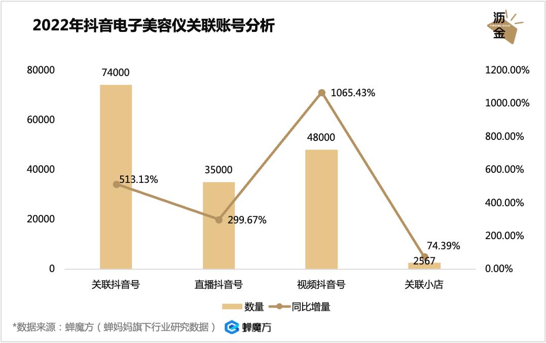 伴随入局的品牌越来越多,抖音电子美容仪关联的账号数和内容也水涨船高。