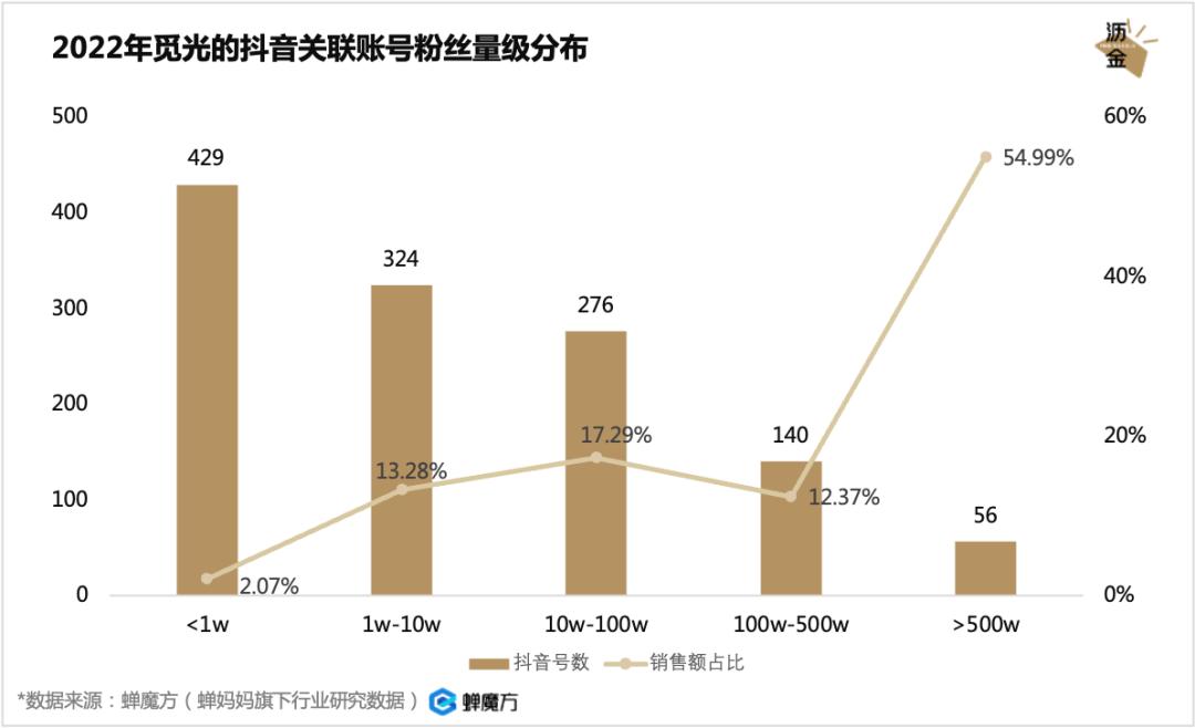 如果继续深扒觅光的达播策略,会发现品牌的达播矩阵以粉丝量排序为正金字塔型,重点布局腰尾部达人,10万粉以下达人的占比高达61.47%。