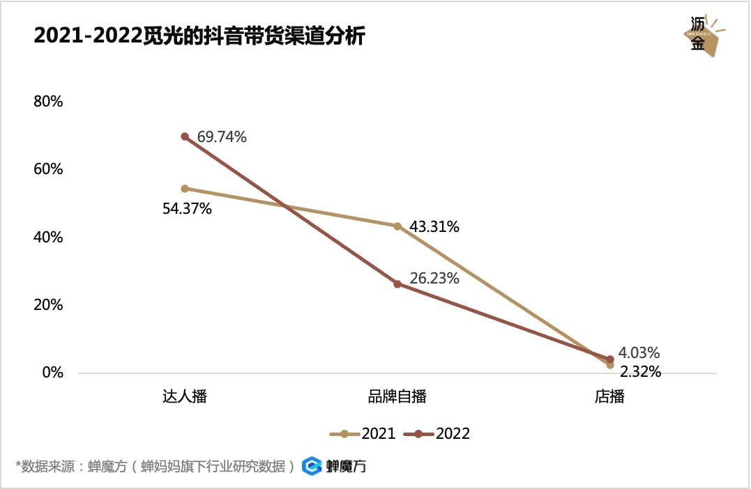 从带货渠道看,觅光在去年显著增加了达播一侧的投入,降低了品牌自播和店播的占比。这意味着,对于较高客单的美容仪品类,达人带货的效率更高。