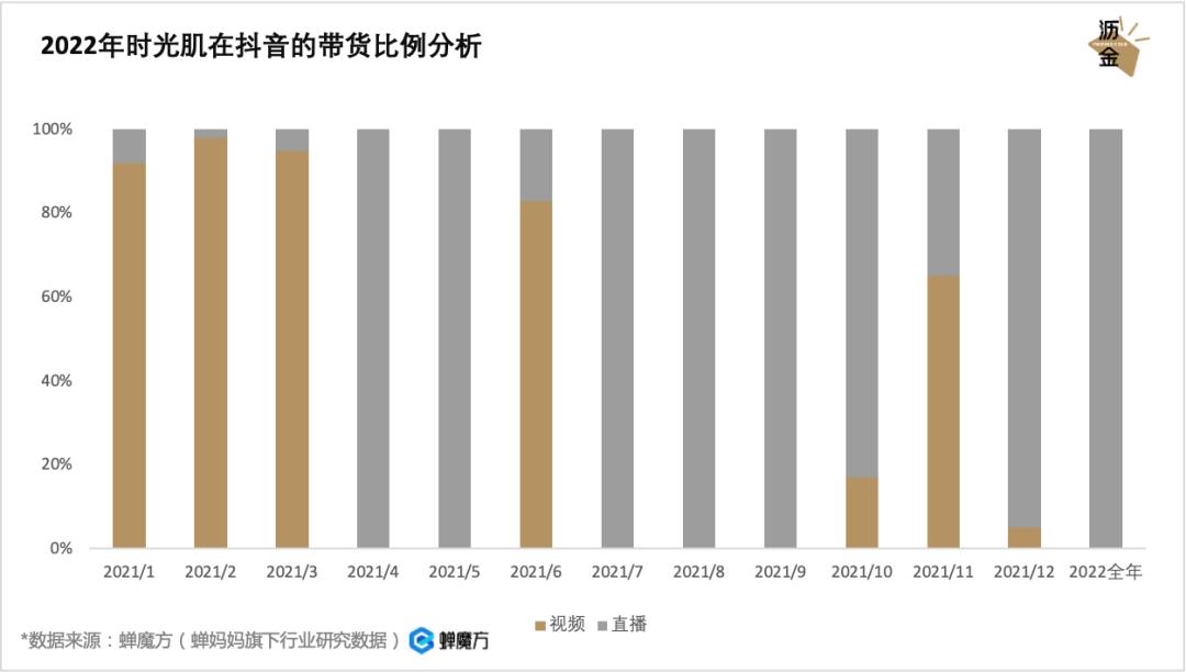 从销售结构看,从2021年12月开始,直播已经成为时光肌的主要销售渠道。