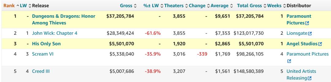 据The-Numbers统计,《龙与地下城》在北美提前场共进账560万美元,推升首日票房达到1522万美元,随后两天分别下滑15%和30%,最终周末数字报收于3721万美元,结合3855家影院的公映范围,可得单馆收益为9651美元。这一成绩高于3千万美元的映前预期,也是自去年暑期档的《不》(4437万美元)后,非续集影片的北美最佳开画。