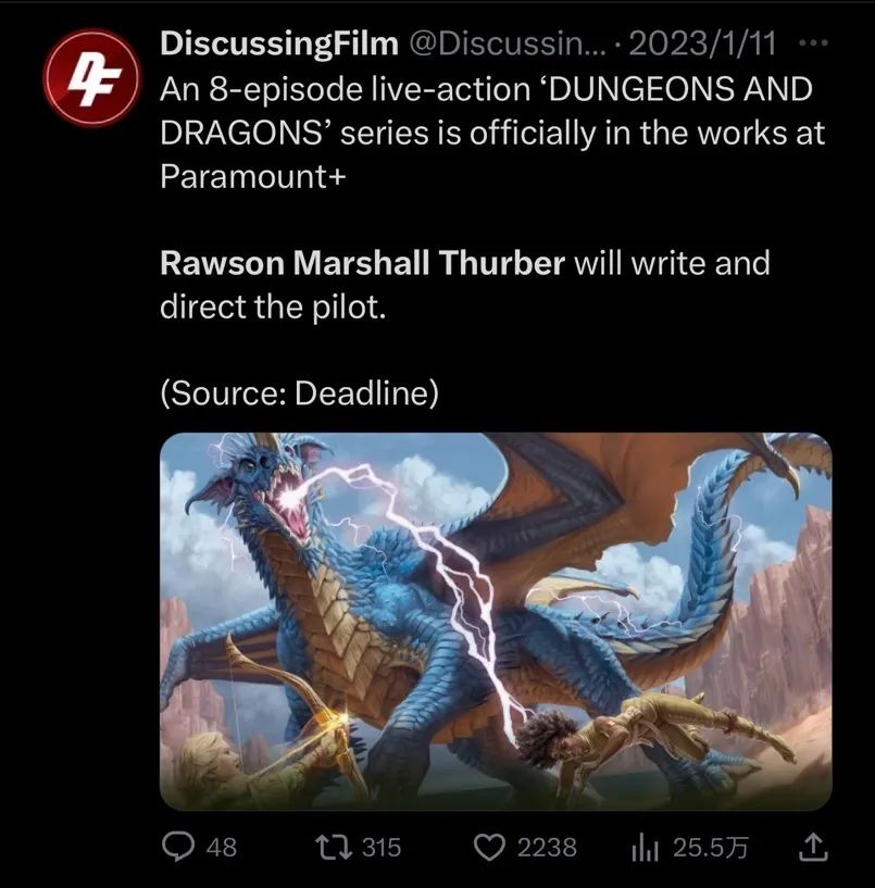 在经过多次档期变动后,《龙与地下城》终于在今年公映。与此同时,衍生自《龙与地下城》的新剧集也在去年官宣,预计将对院线电影的故事形成“补充”。据报道,派拉蒙旗下的流媒体Paramount+已预定全季,将由eOne和派拉蒙影业进行制作。