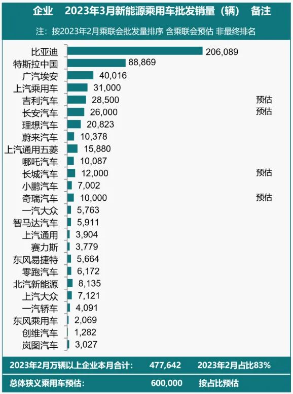 从销量上看,2022年3月,传统车企旗下新能源品牌表现亮眼。广汽埃安销量40016辆,同比增长97%。吉利新能源(含吉利、领克、极氪、睿蓝)销量达到28093辆,同比增长超98%。此外,比亚迪、特斯拉的销量也在不断增长。2023年3月比亚迪汽车销量207080辆,同比增长97.4%;特斯拉上海超级工厂3月共计交付88869辆,同比增长35%。