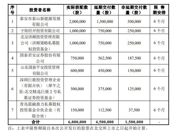 在已完成缴款的战略配售环节,迪尔化工引入犀牛之星、泰安市泰山新能源发展有限公司 、宁阳经开投资有限公司以及国泰君安证券等7家战投。本次发行战略配售股份合计 600万股,占本次发行规模的 20.00%(不含超额配售部分股票数量),发行价格为 3.98 元/股,战略配售募集资金金额合计 2388万元。