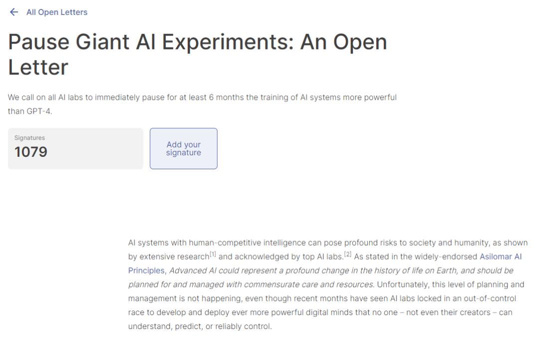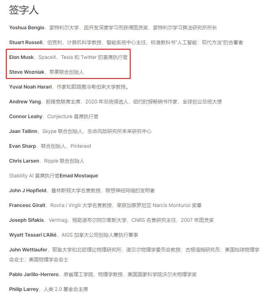 前不久,一封由埃隆·马斯克、苹果联合创始人史蒂夫·沃兹尼亚克、图灵奖获得者Yoshua Bengio等大公司高管、科学家签名的公开信,在网上流传开来。