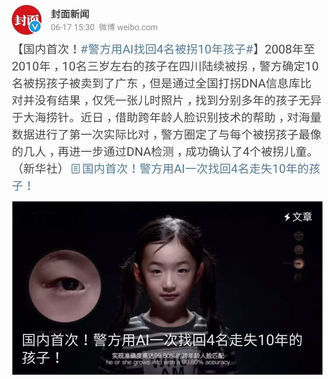 早在几年前,便有警方通过AI技术,找回了4名被拐长达10年的儿童,使用的仅仅是TA们一张儿时的照片。