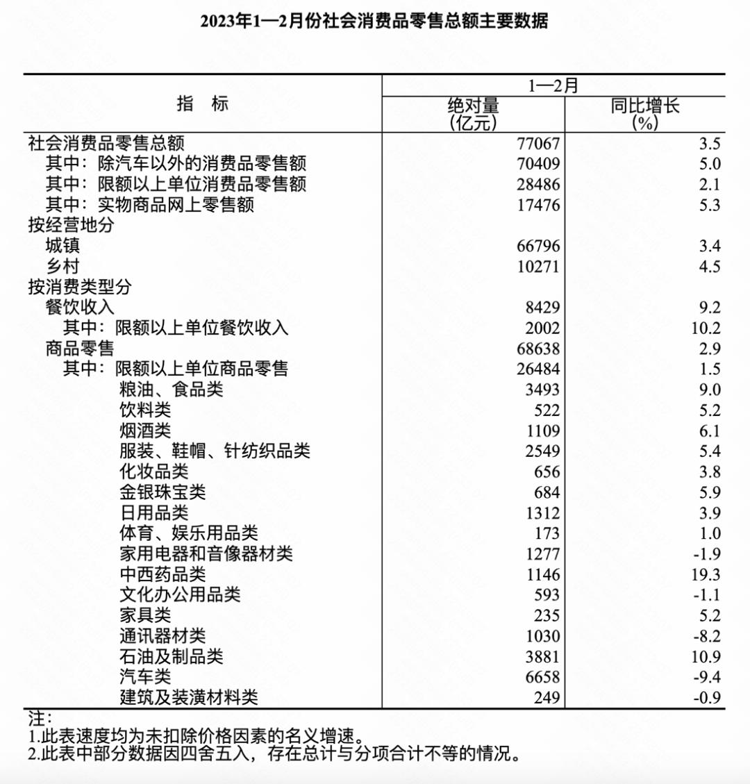 2023年1-2月份,社会消费品零售总额77067亿元,同比增长3.5%。其中,除汽车以外的消费品零售额70409亿元,增长5.0%。其中食品、餐饮类消费增长速度较快。